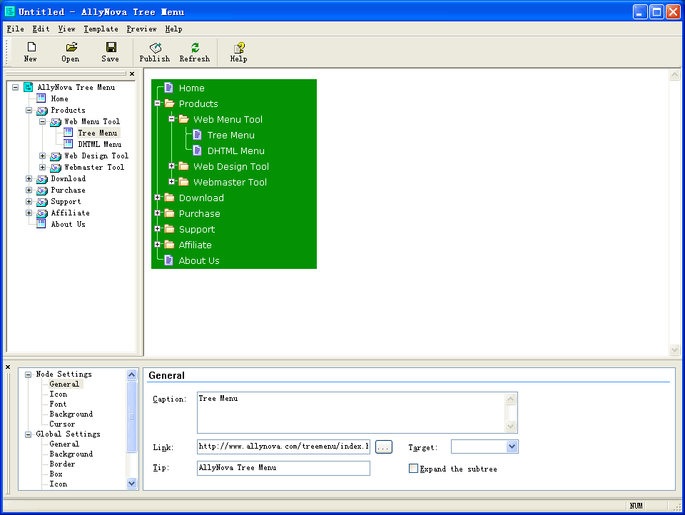 軟體簡介:AllyNova Tree Menu能夠為網頁創建JavaScript樹形功能表、CSS樹形功能表,只需要幾下點擊即可。